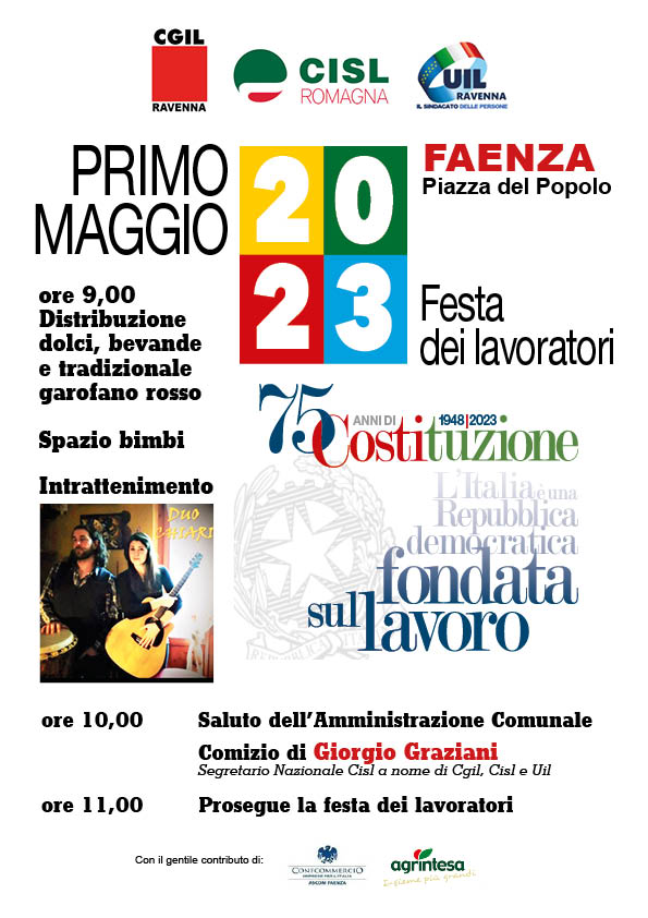 A Faenza, il Primo Maggio sarà festeggiato in piazza del Popolo. Alle 9 è in programma una distribuzione di dolci e bevande e del garofano rosso. In contemporanea vi sarà un intrattenimento a cura del Duo-Chiari. Alle 10 è previsto il saluto del sindaco Massimo Isola e poi prenderà la parola Giorgio Graziani, segretario nazionale Cisl, a nome di Cgil, Cisl e Uil.